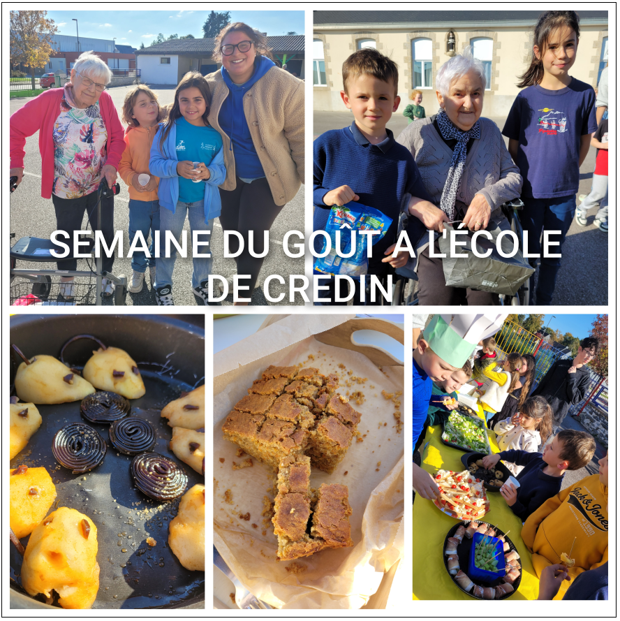 Semaine du goût à l’école de Crédin, participation des résidentes à la dégustation: découverte du gâteau aux carottes et des souris: poire/réglisse!