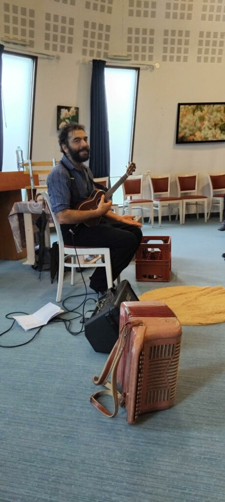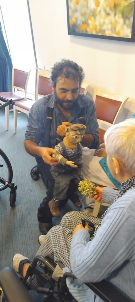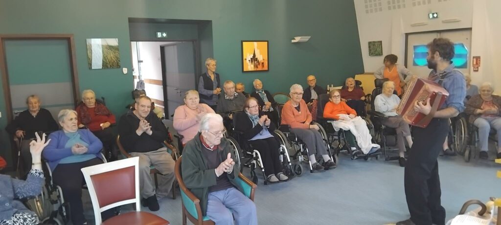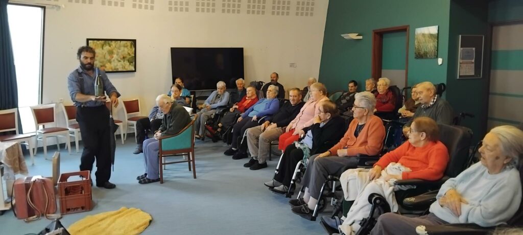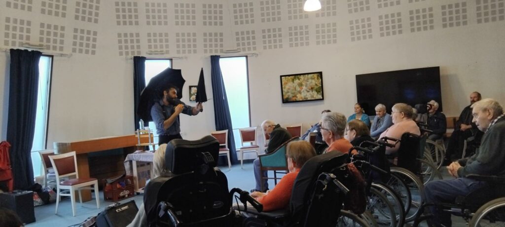 Julien est un comédien mais aussi un musicien et un jongleur. Aujourd’hui à l ‘Ehpad il a jongler avec des balles, des parapluies, des bouteilles… il à jouer de l’accordéon et du Ukulélé et fait des marionnettes … Un spectacle fantastique très apprécié des résidents!